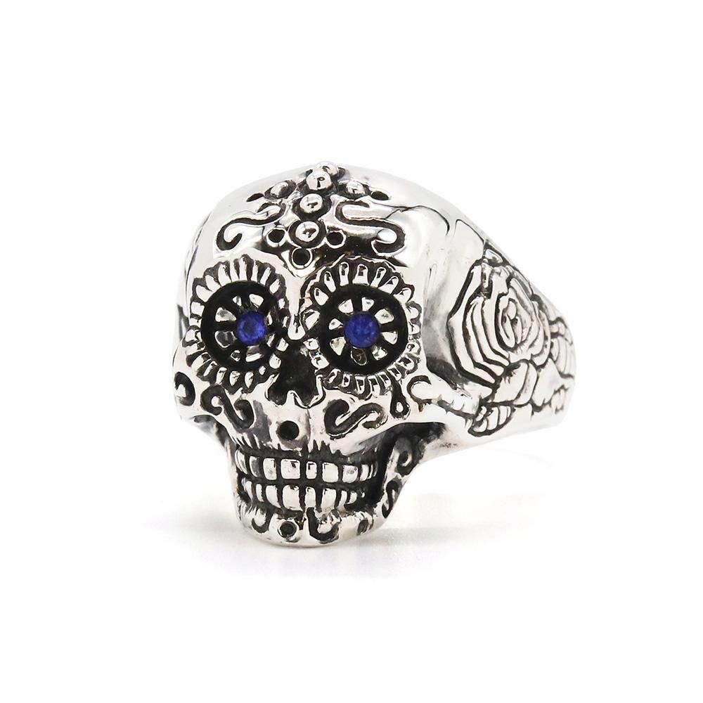 Es【エス】の代表作であるメキシカンスカルリングの眼に天然石のサファイアをセットした豪華な逸品。